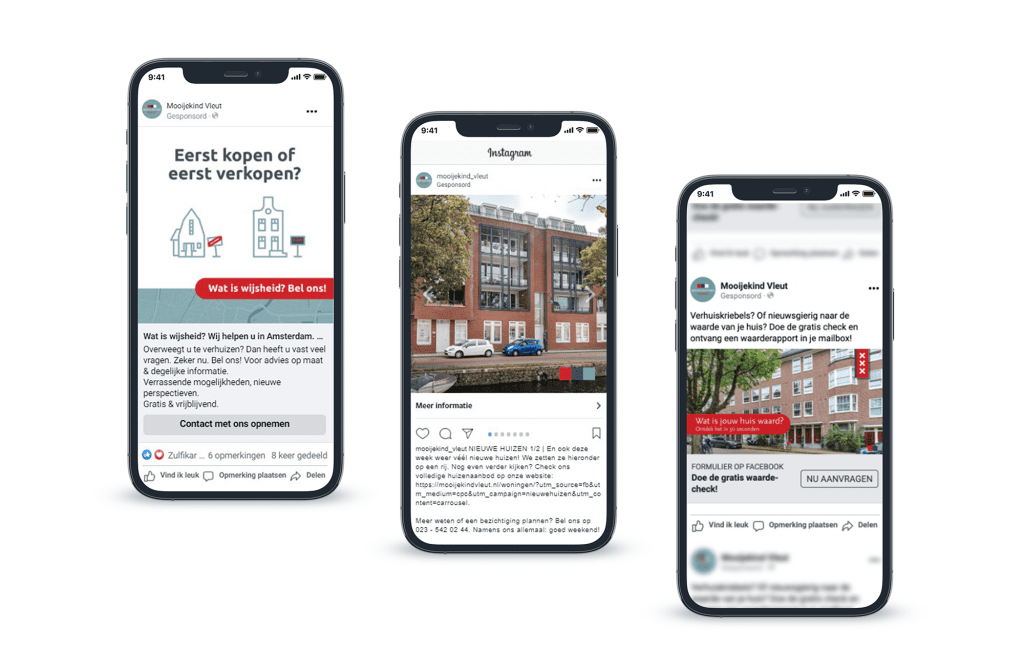 Naast de SEO werkzaamheden hebben wij ook advertenties online staan op Google, Facebook & Instagram. Hier promoten wij bijvoorbeeld de maandelijkse nieuwbouw update, de nieuwsbrief en advertenties voor advies op maat. Per locatie hebben wij aparte advertentie sets ingesteld zodat de content zo relevant mogelijk is en de persoon bij de juiste locatie terecht komt. Iemand die in Amsterdam woont wil natuurlijk contact hebben met het kantoor in Amsterdam en niet in Hoofddorp.