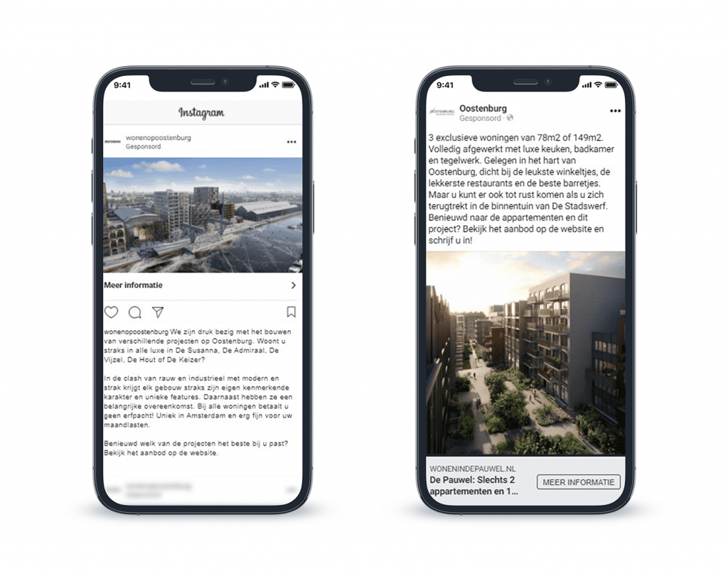 Daarnaast hebben we voor de verschillende sub-projecten binnen het gebied Oostenburg de klant na de eerste trigger verder door de klantreis begeleid door het inzetten van Google Search ads, Social Media ads via zowel Facebook en instagram. Verder werd de kwaliteit van de leads verhoogd door het inzetten van lead ads, met daaraan gekoppeld een e-mail automation om ervoor te zorgen dat de inschrijvers voor de projecten dit volledig geïnformeerd deden zodat het aantal afvallers na inschrijving omlaag ging.