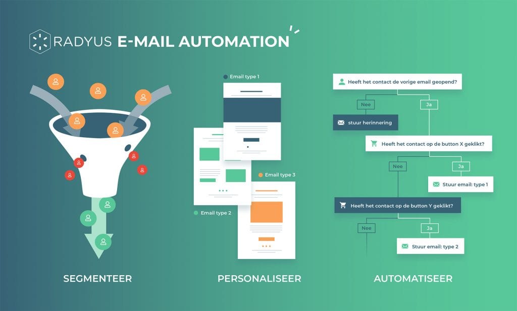 De opvolging van leads kun je automatiseren. Met e-mail automation wordt elke nieuwe lead direct opgevolgd met een persoonlijke mail op maat. Zonder dat jij er omkijken naar hebt. Hoe gaaf is dat? Op basis van hun fase in de klantreis krijgen ze informatie waar ze op dat moment behoefte aan hebben. Informatie die aansluit bij de oriëntatie, interesse of beslissingsfase. Door deze adequate opvolging worden alle geïnteresseerden op tijd en op maat geïnformeerd. Hierdoor blijven ze aangehaakt en kunnen ze goed geïnformeerd en zelfverzekerd een keuze maken.